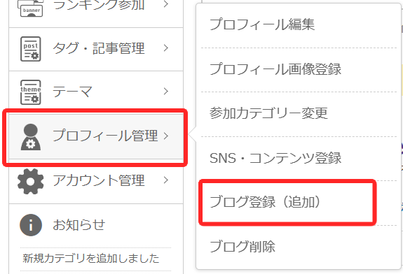 マイページにログインして、ブログの追加➡ブログ情報の登録・参加カテゴリーの設定。