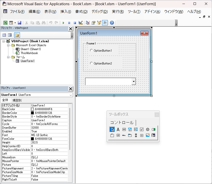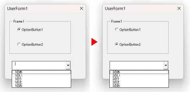 これで、フォームを立ち上げると、ボタンを押しかえると、下のリストが変わります。