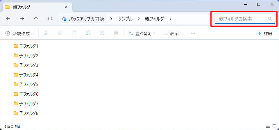 親フォルダの階層まで戻って、右上の検索窓に、検索したいフォルダ名を入れます。