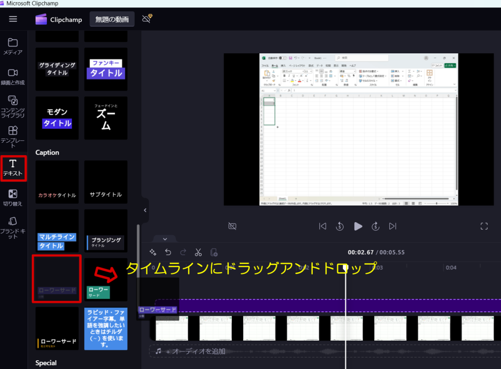 左の『テキスト』をクリックして、使いたい素材をタイムラインにドラッグアンドドロップします。
