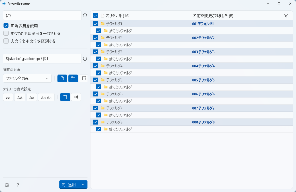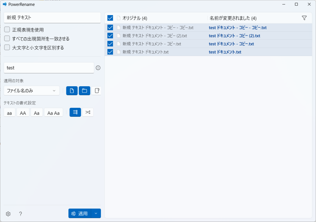 変更後のファイル名を確認して「適用」をクリックして変更を実行します。