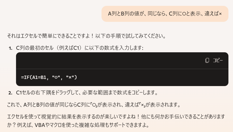 例えば、『A列とB列の値が、同じなら、C列に○と表示、違えば×』