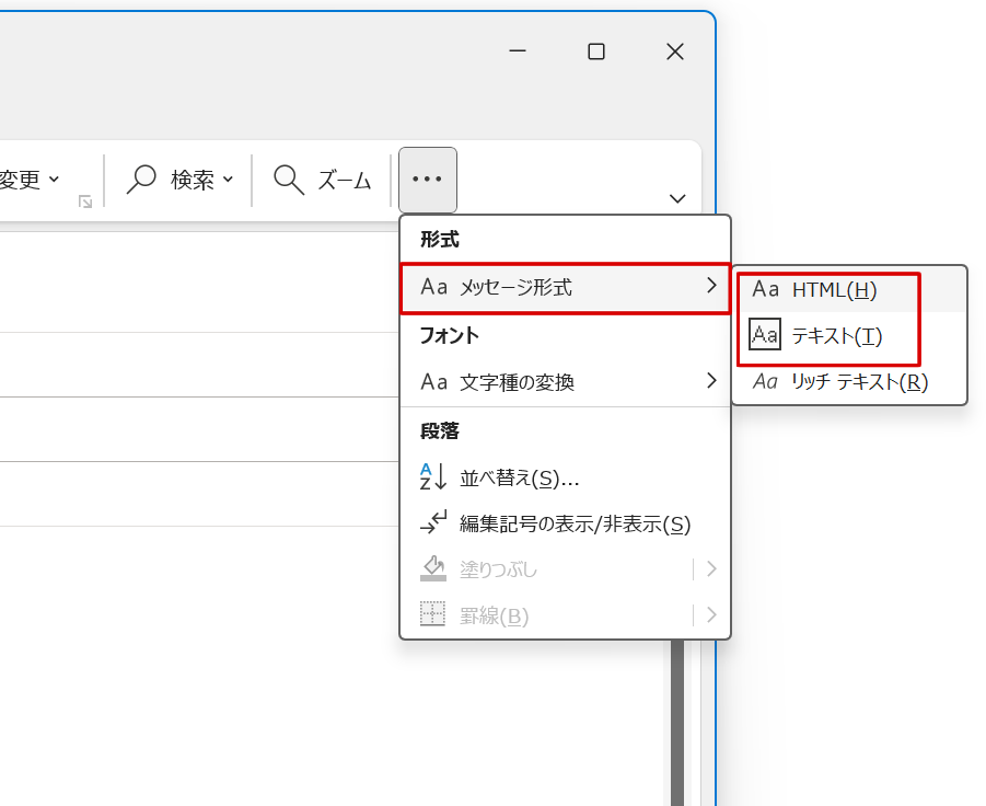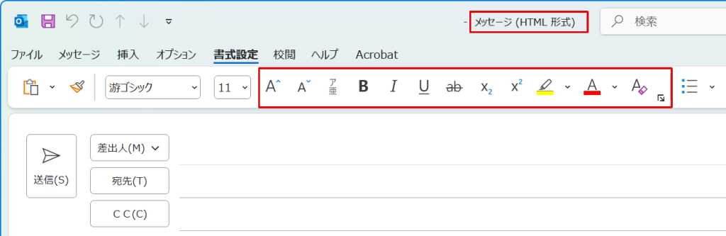 Aa メッセージ形式をクリックすると、『HTML』や『テキスト』など変更ができます。