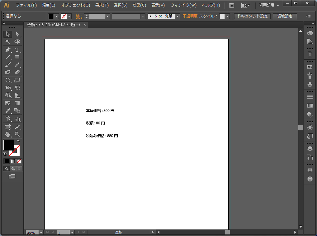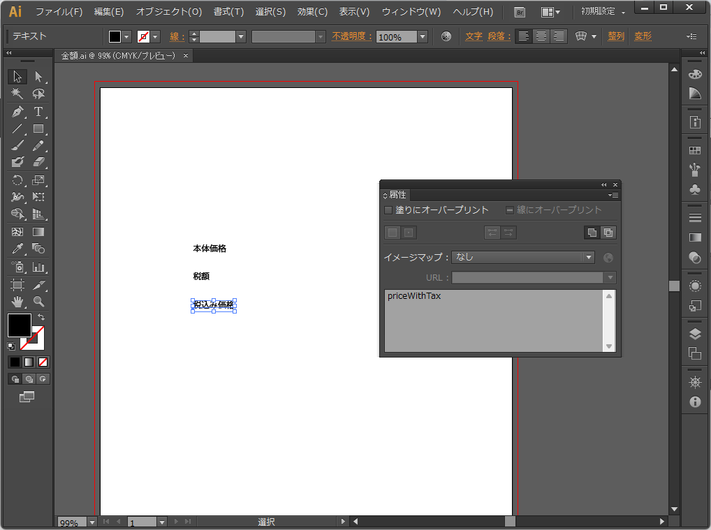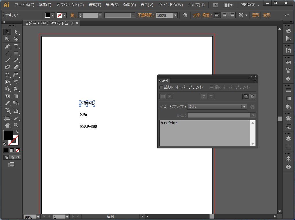 イラレでテンプレートを作成します。本体価格を入れるところ属性名に”basePrice”、税額は”taxAmount”、税込み価格は”priceWithTax”を設定。