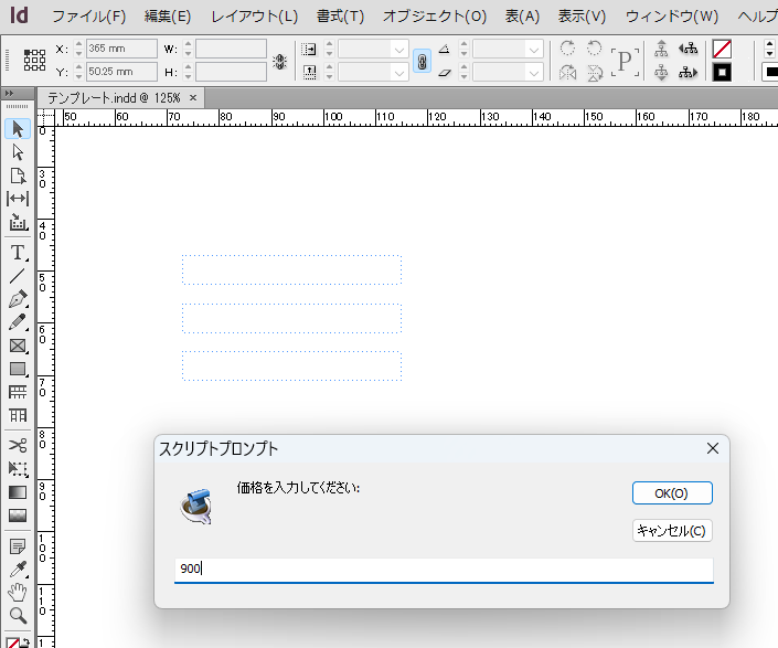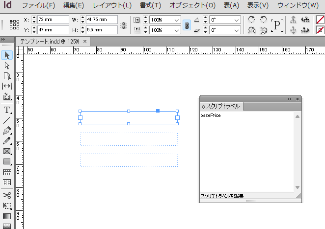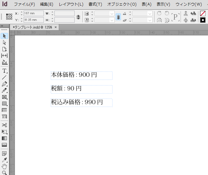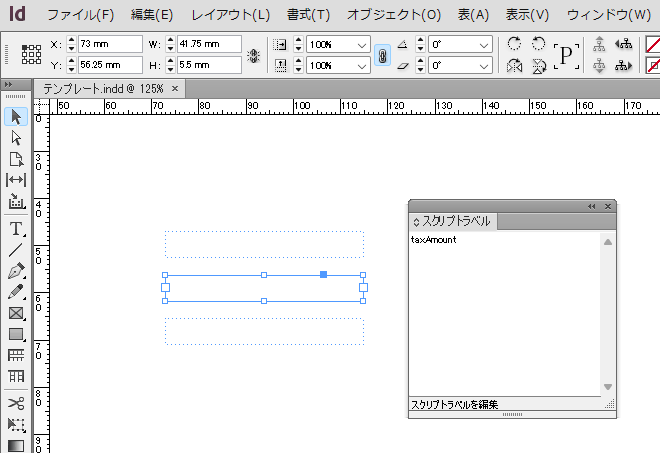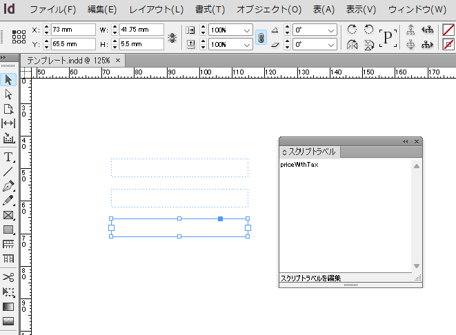 インデザインでテンプレートを作成します。本体価格を入れるところにスクリプトラベルに”basePrice”、税額は”taxAmount”、税込み価格は”priceWithTax”を設定。