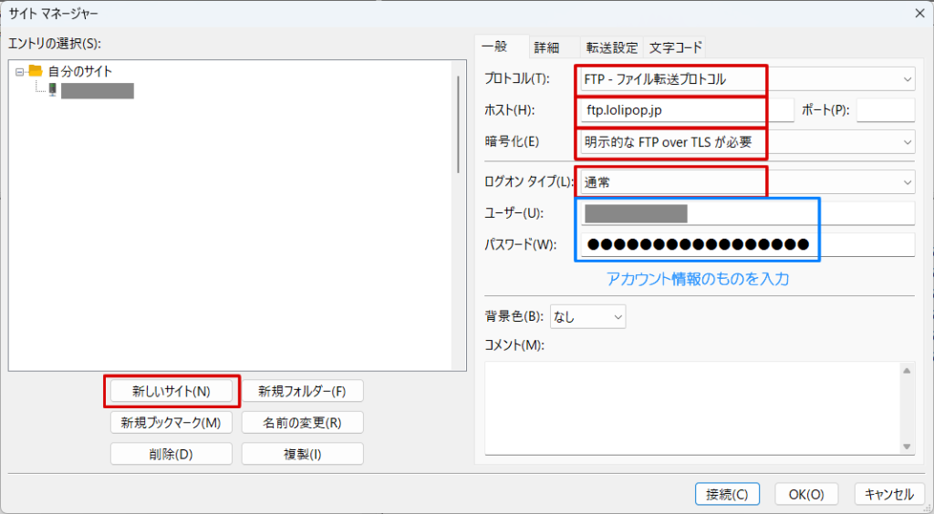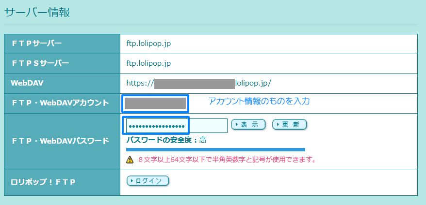 FTP・WebDAVアカウントとFTP・WebDAVパスワードが必要です。